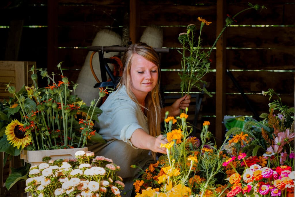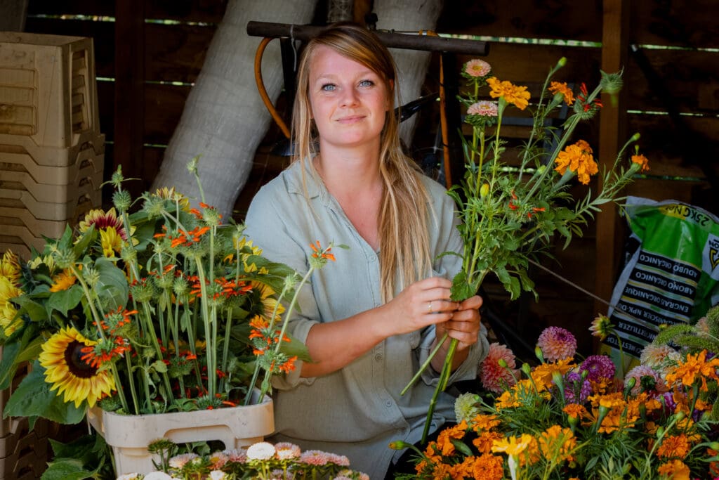 Ooit begon Jennita met een klein stukje volkstuin, waar groenten, fruit en bloemen samengroeiden. Dat ontkiemde tot een eigen biologische bloemenkwekerij in het dorp: “Ik werk samen met de natuur. Dus geen kunstmatige hulpmiddelen, maar vertrouwen op seizoenen, bodem en biodiversiteit. Dat zorgt voor gezonde planten én een gezonde omgeving.”